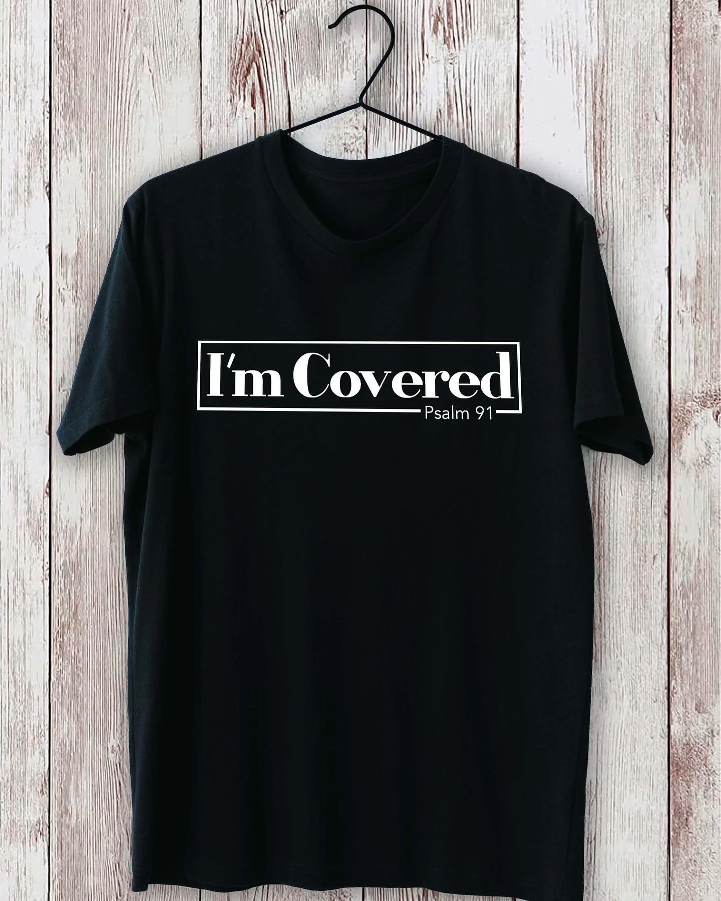 Image 1 of 1 I'm Covered Unisex Black T-shirt - 100% Cotton $13.99 Made with 100% Cotton. Size: S M L Quantity: Add To Cart Added! Made with 100% Cotton.